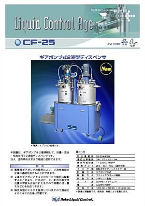 - CF-25 は、ギアポンプを2基搭載して、計量・混合・吐出を行う2液型ディスペンサです。注入、塗布等さまざまな用途に使用できます。
